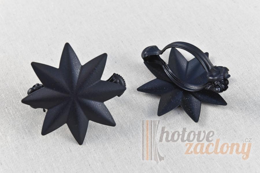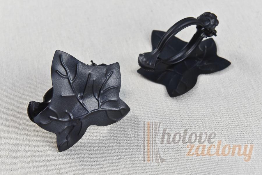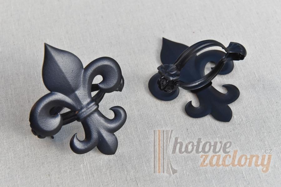 Žabka na uchycení záclony z kovu - balené do páru. V ponuce vzory: štít, hvězda, list.