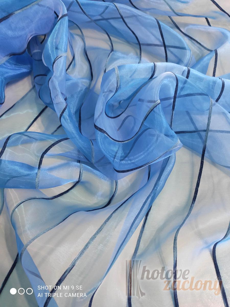 Záclona metrážová modrá voál je průsvitná moderní záclona se svislým vzorem, který opticky prodlužuje okno. Zátěžové olůvko zajišťuje rovný a elegantní pád látky. Vhodná do obývacího pokoje i ložnice.